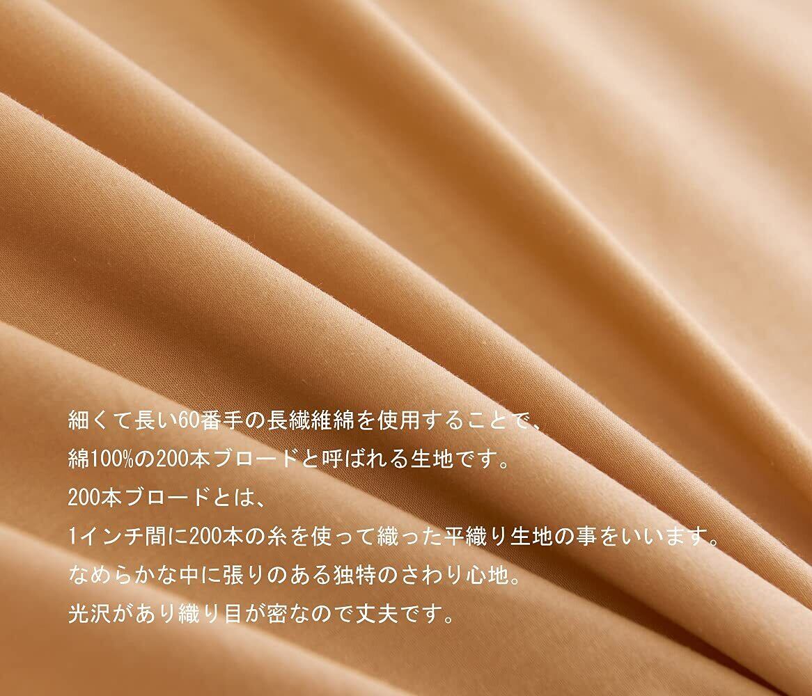 【心地よい綿100%生地】上品な超極細・長繊維綿を使用することで、なめらかな中に張りのある独特のさわり心地。 高密度の織りが、ダニや花粉からあなたの眠りを守ってくれます。光沢があり織り目が密なので丈夫です。洗濯を重ねるうちに生地も柔らかくなりお肌に馴染みやすくなり、より心地よくなります。