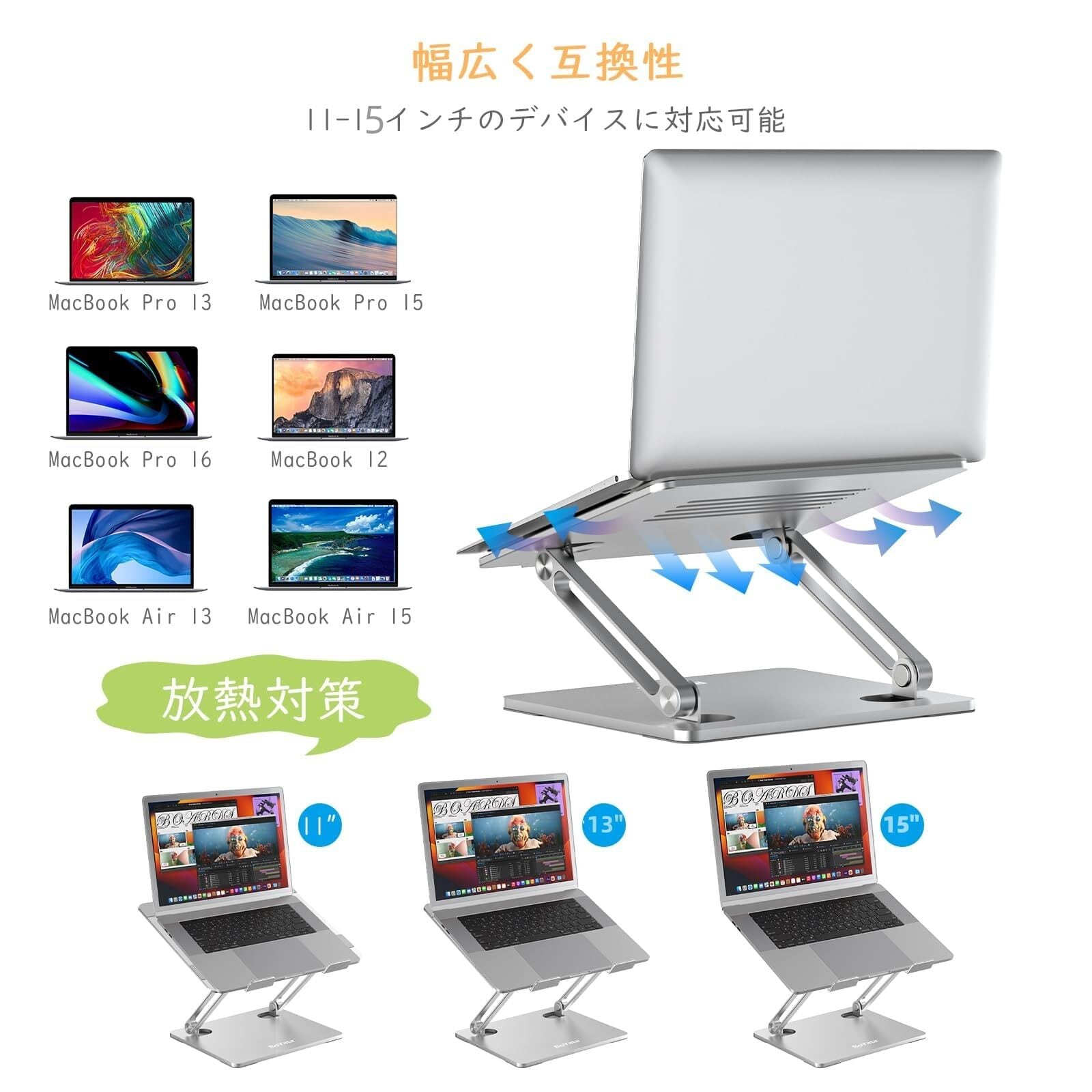 このスタンドは、15インチ以下のノートパソコンに対応しており、多くの機種にぴったりフィットします。あなたのノートPCをしっかりとホールドし、安心して使用できます。ビジネスシーンはもちろん、趣味の活動にも活躍します。