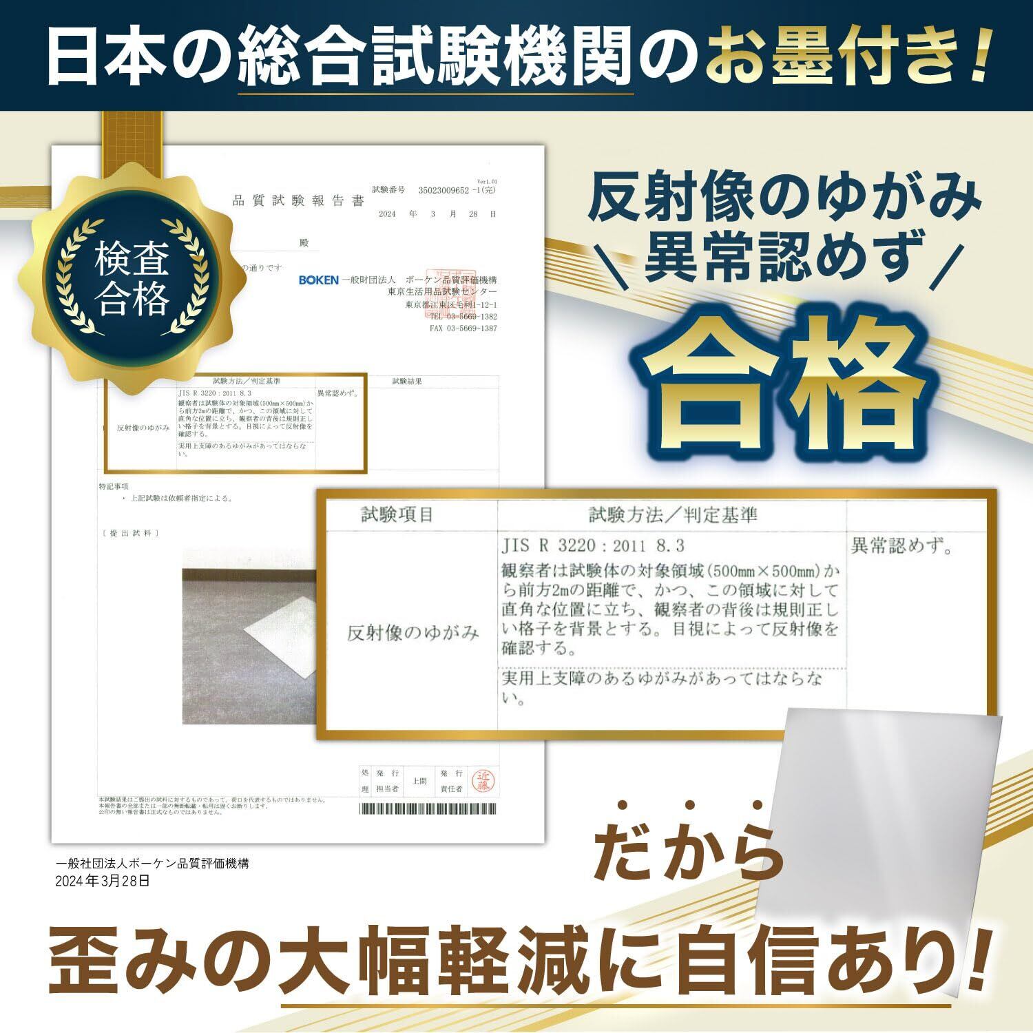 【歪み大幅軽減】従来のアクリルミラーの欠点はガラスミラーに比べて歪みがありましたが、ミラーは歪みを大幅に軽減しています。※アクリル素材のため、歪みが完全にない訳では御座いません。ガラスと同等レベルではありません。