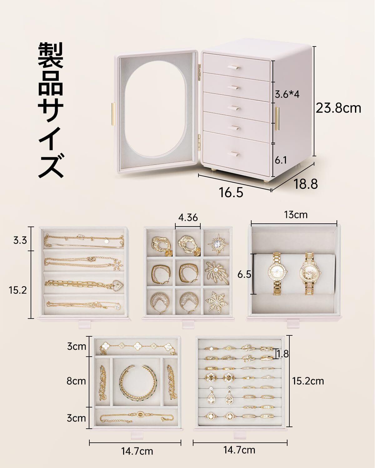 【5段式ジュエリーボックス】:この大きなジュエリーボックスには、多機能の収納スペースで、リングやイヤリング、ネックレス、ブレスレット、腕時計などを収納できます。機能性と美しさを兼ね備えたこのジュエリーボックスは、日常使用にもデザインを楽しむ特別な場面にもピッタリです。