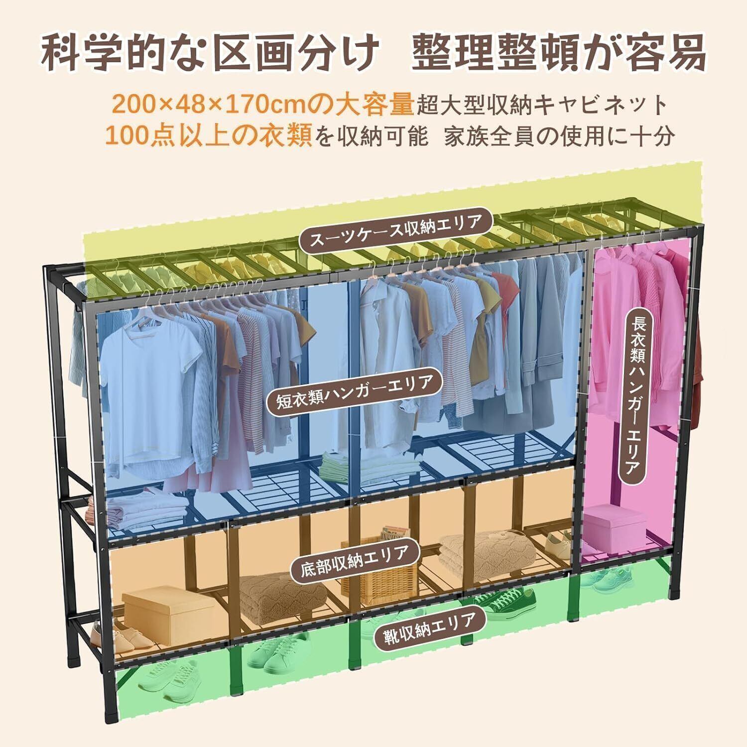 ■特徴: 高耐荷重、スチール製、組み立て簡単、省スペース、防水・防塵・防汚、ハンガー8個付き、日本語説明書付き