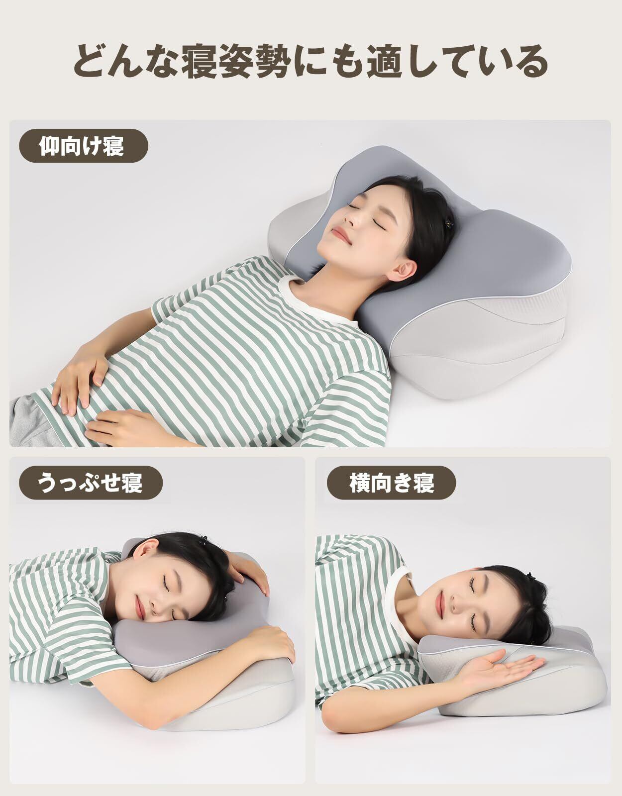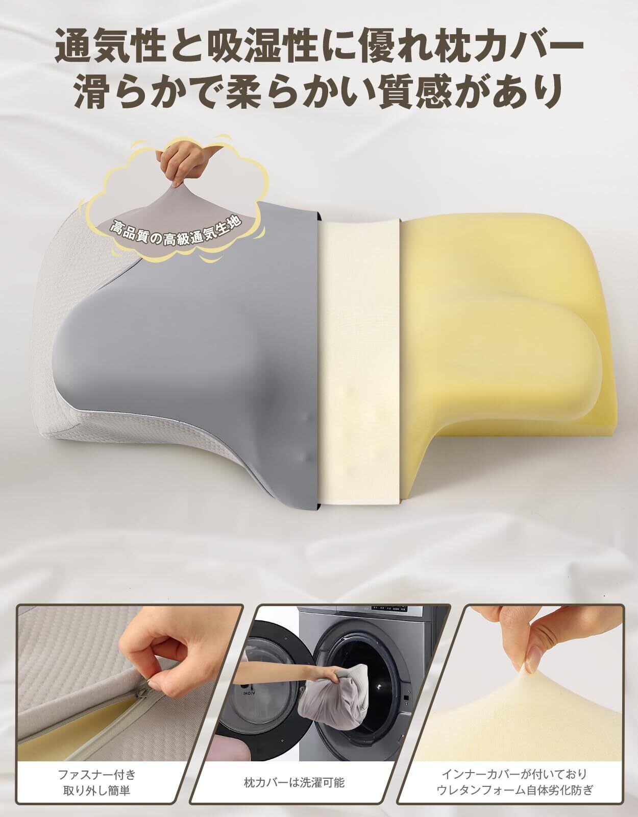 ■特徴: 調整可能、高め・低め幅広い選択肢、洗えるカバー、横向き寝・仰向き寝対応