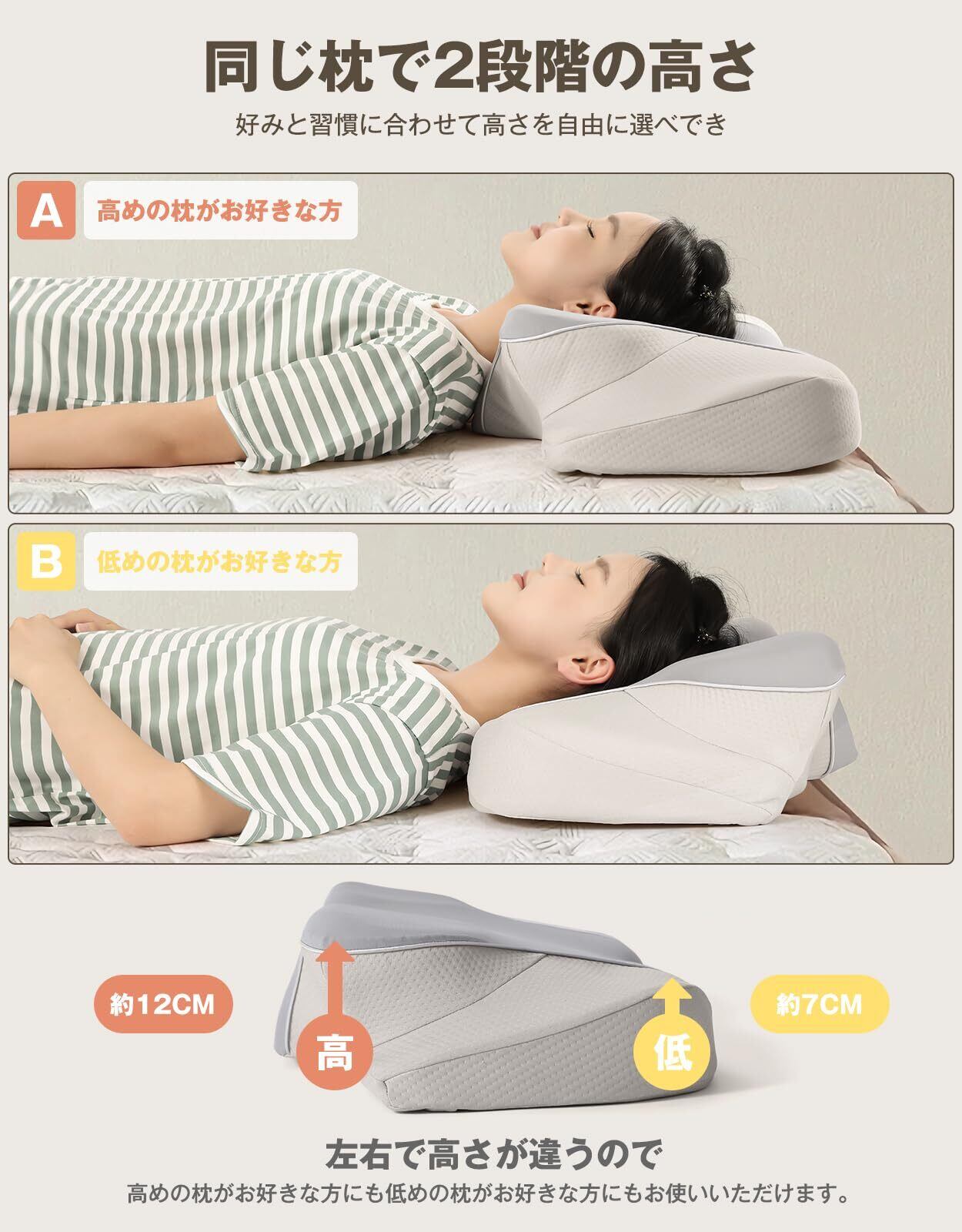【2段階の高さ調節可能】同じ枕で2種類の高さ(低め:約7cm、高め:約12cm)をお選びいただけます。お客様の体型や寝姿勢に合わせてご利用いただけます。