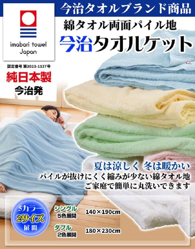 「タオルケット ダブル」は、180×230cmの広々としたサイズで、シンプルな無地デザインが特徴です。日本製の安心感と、綿100%のパイル生地を使用しているため、ふんわりとした肌触りを実現。上質な素材が心地よい眠りをサポートします。
