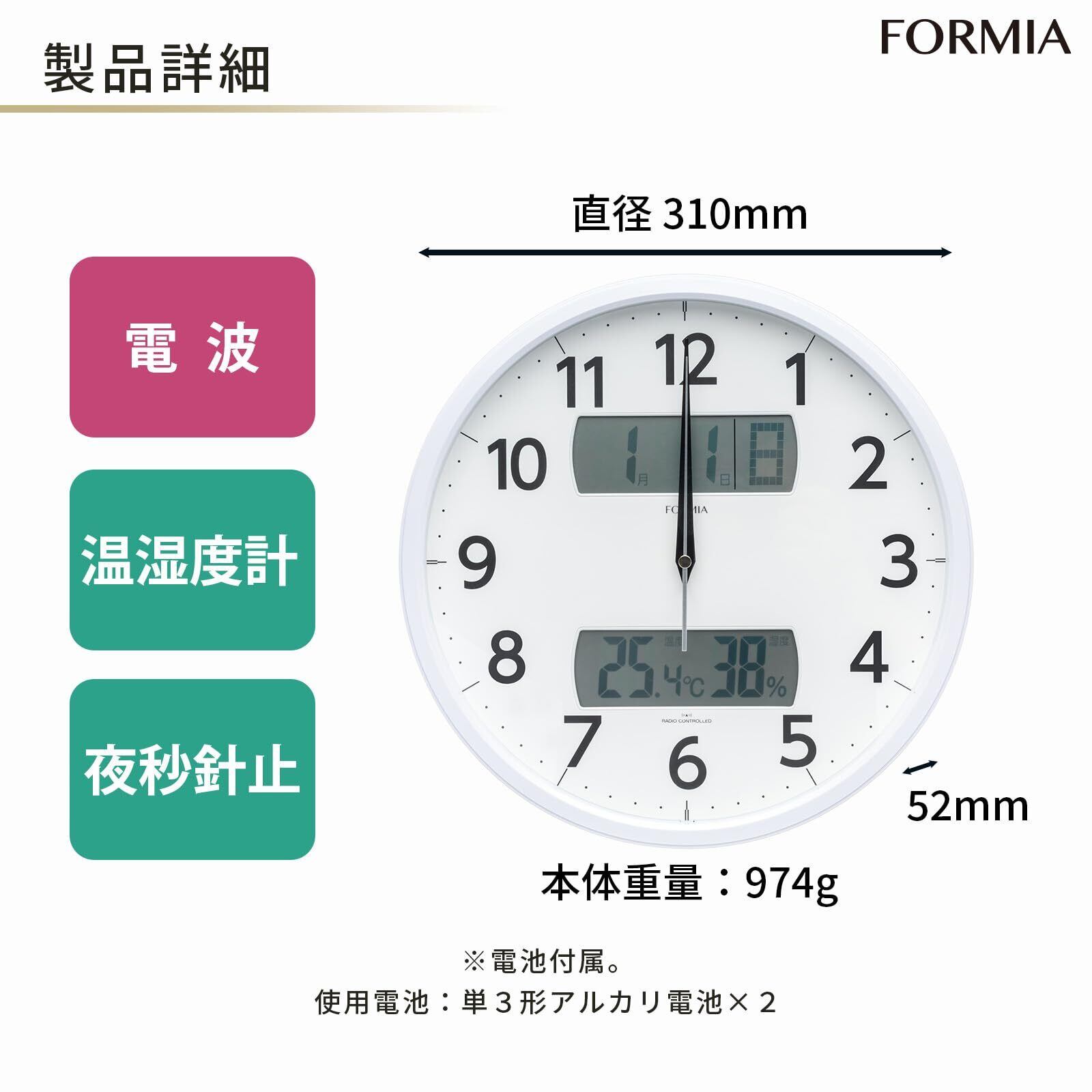 【限定】Formia(フォルミア) 掛け時計 時計 壁掛け 電波時計 温度 湿度 温湿度計 日付 カレンダー 曜日 夜間秒針停止 静音 アナログ 会社 オフィス リビング ダイニング 寝室 ホワイト