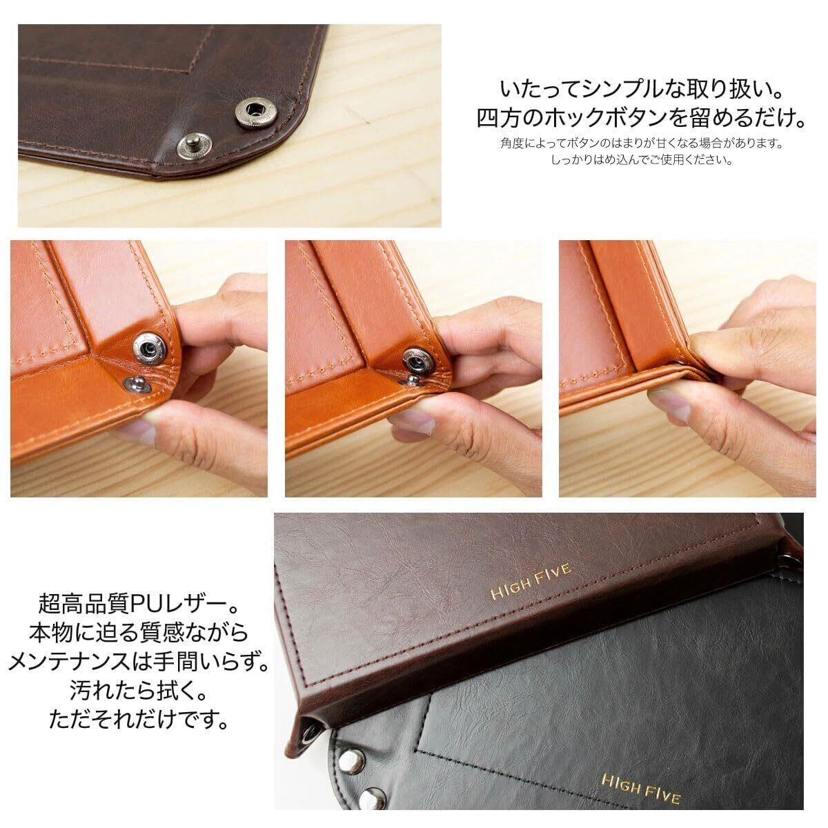 「[HIGH FIVE]長方形レザートレイ」は、シックなブラックカラーが魅力の仕切り付きトレーです。アクセサリー、腕時計、指輪、スマホ、鍵など、様々な小物を整理整頓でき、デスクや玄関、車内での使い勝手も抜群です。おしゃれで洗練されたデザインは、どんなインテリアにもマッチします。