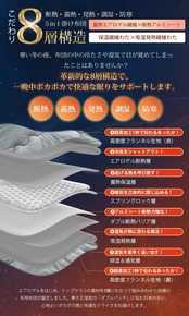 特徴 8層構造:断熱・蓄熱・発熱・調湿・防寒, 高密度フランネル·極上触感