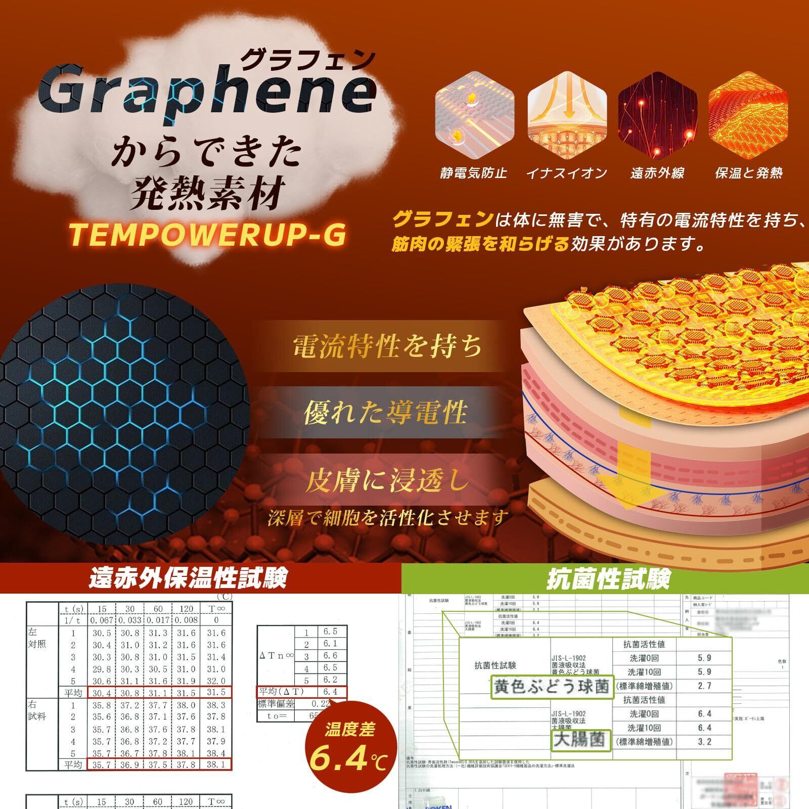 【「技術」グラフェン(graphene)繊維とは】天然鉱物が含まれて、人体に近い6~14umの遠赤外線光波を発する結合炭素原子のシート状物質です。の掛け布団は高機能グラフェン素材「TEMPOWERUP-G」中綿を使用、素速く発熱し、均一で適切な温度を安定できます。また、非常に優れた導電性を持ち、室温での熱伝導率と電気伝導率は、銅と同等で静電気防止を実現します。抗菌防臭の特性があり、清潔な睡眠環境を保ちます。