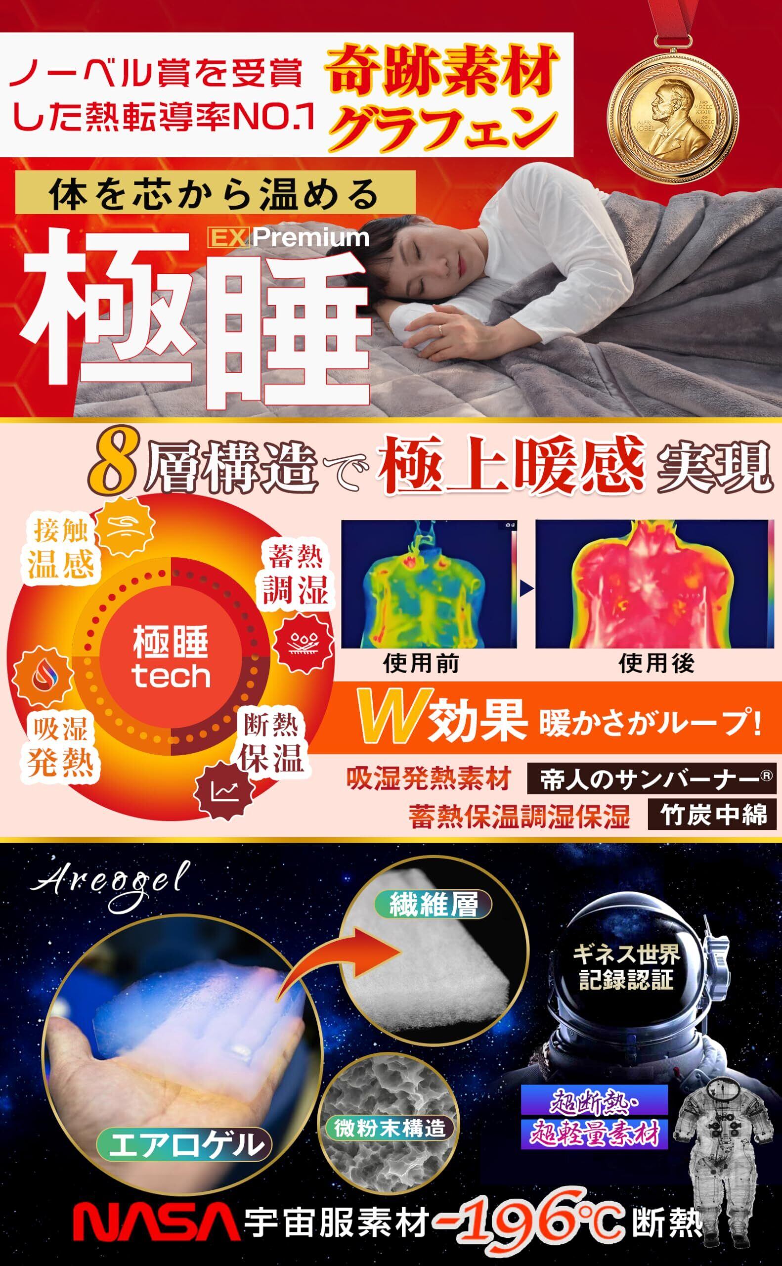 W断熱技術としてエアロゲルとアルミシートを組み合わせ、非常に軽量ながらも優れた保温効果を発揮します。包まれるような柔らかいフランネル素材があなたを優しく包み込み、暖かさを持続させます。寒い冬も心地よい眠りをすぐに実感!