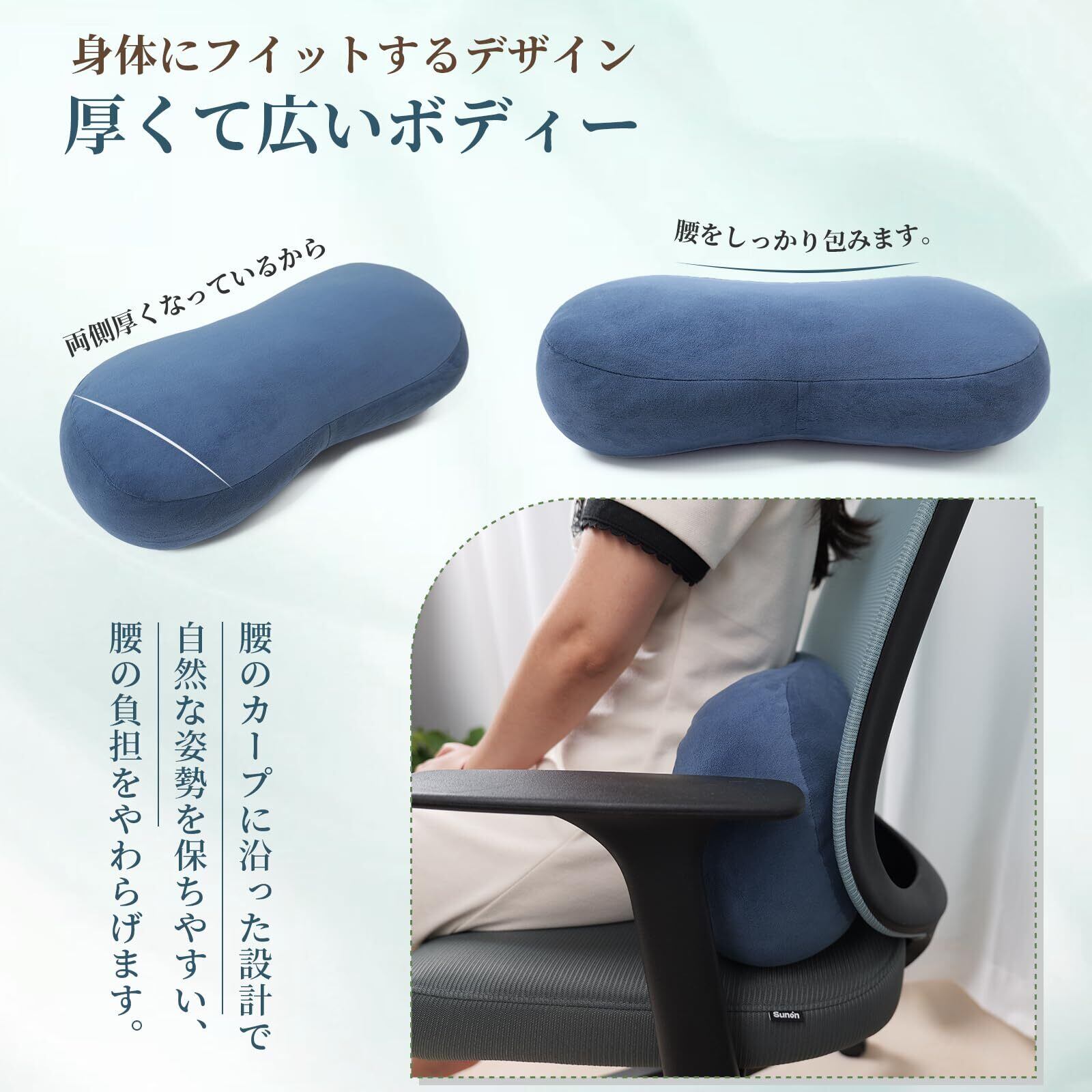 「理想的なサポート」:腰の自然なカーブにぴったりフィットする設計。背骨の正しい姿勢を保ち、腰への負担をしっかり軽減します。デスクワークや運転時の辛さを和らげます。