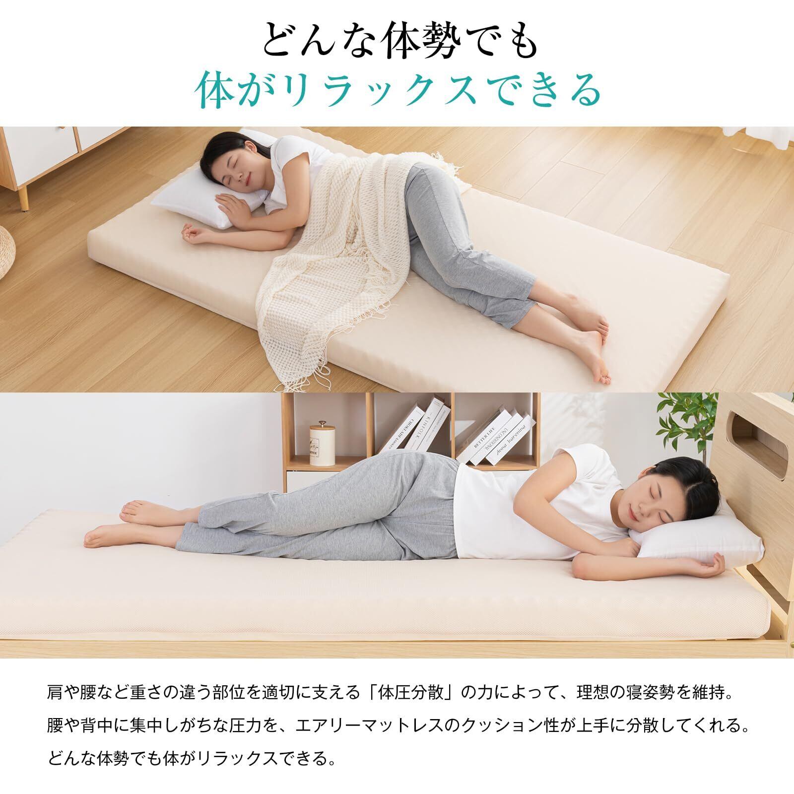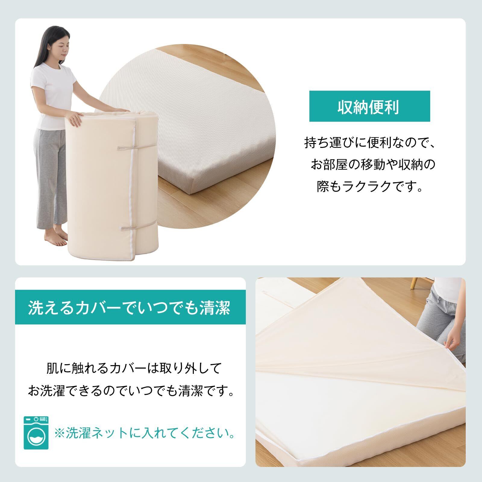 【注意事項】開封後すぐは、ウレタン特有のにおいがする場合がございます。人体に影響はありませんが、気になる場合は風通しの良い場所で陰干しして頂くことで、通常より早くにおいが消えます / 開封後に商品のしわが戻りにくい場合は、スチームアイロンで改善します / マットレスは通常環境下にて、1~2日で元通りに復元します。【ご購入前にご確認ください】●マットレス表面を凹凸加工している構造のため体重100kgを超える方には求める硬さが得られない場合がございます。