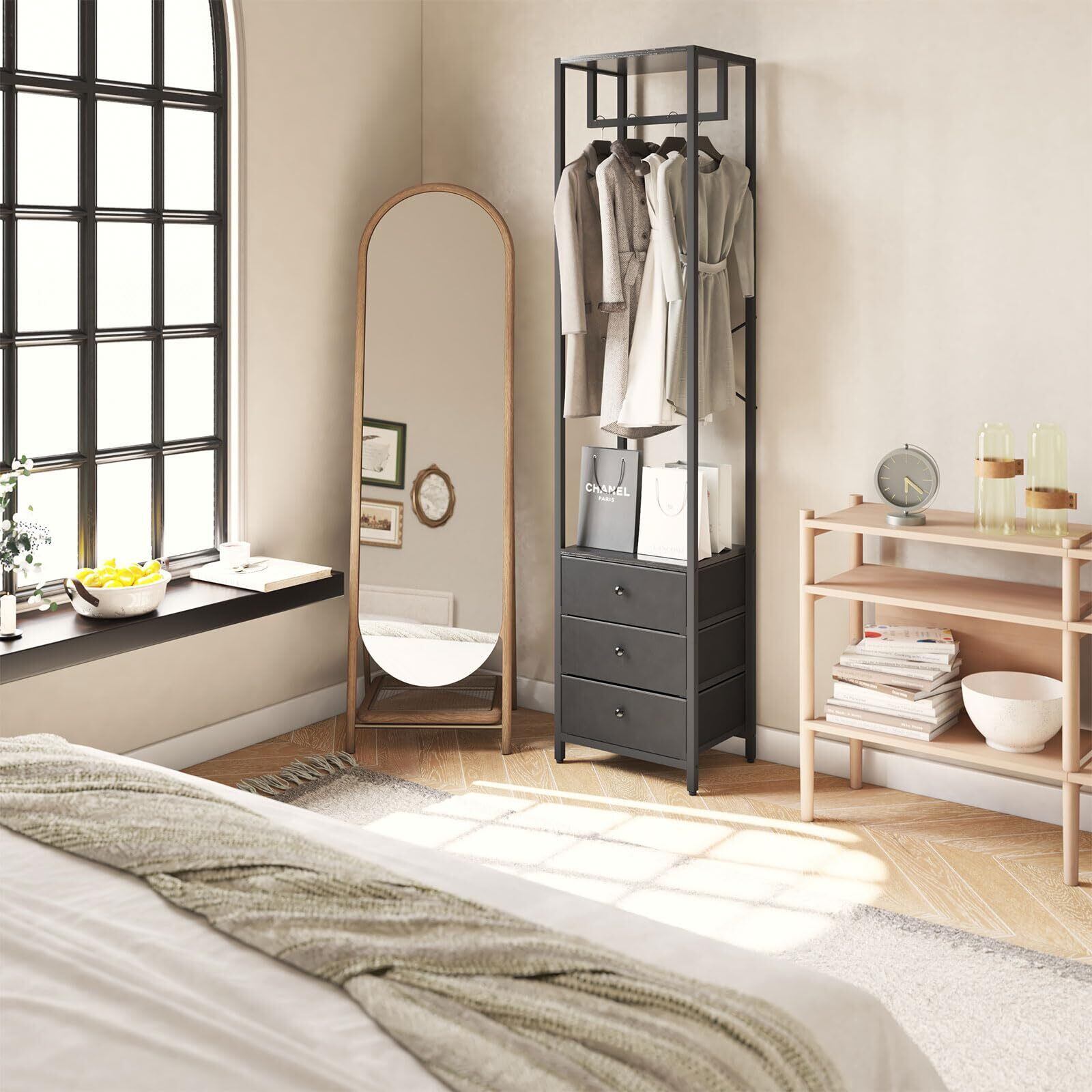 【特価セール】YMYNY ハンガーラック スリム ハンガーチェスト 3段 ファブリック引き出し付き 棚付き 省スペース 大容量収納ラック 組み立て簡単 パイプハンガー ワードローブ クローゼット 洋服ラック 衣類収納 収納押し入れ コート掛け 39x29x179cm ブラック JPHGR001B