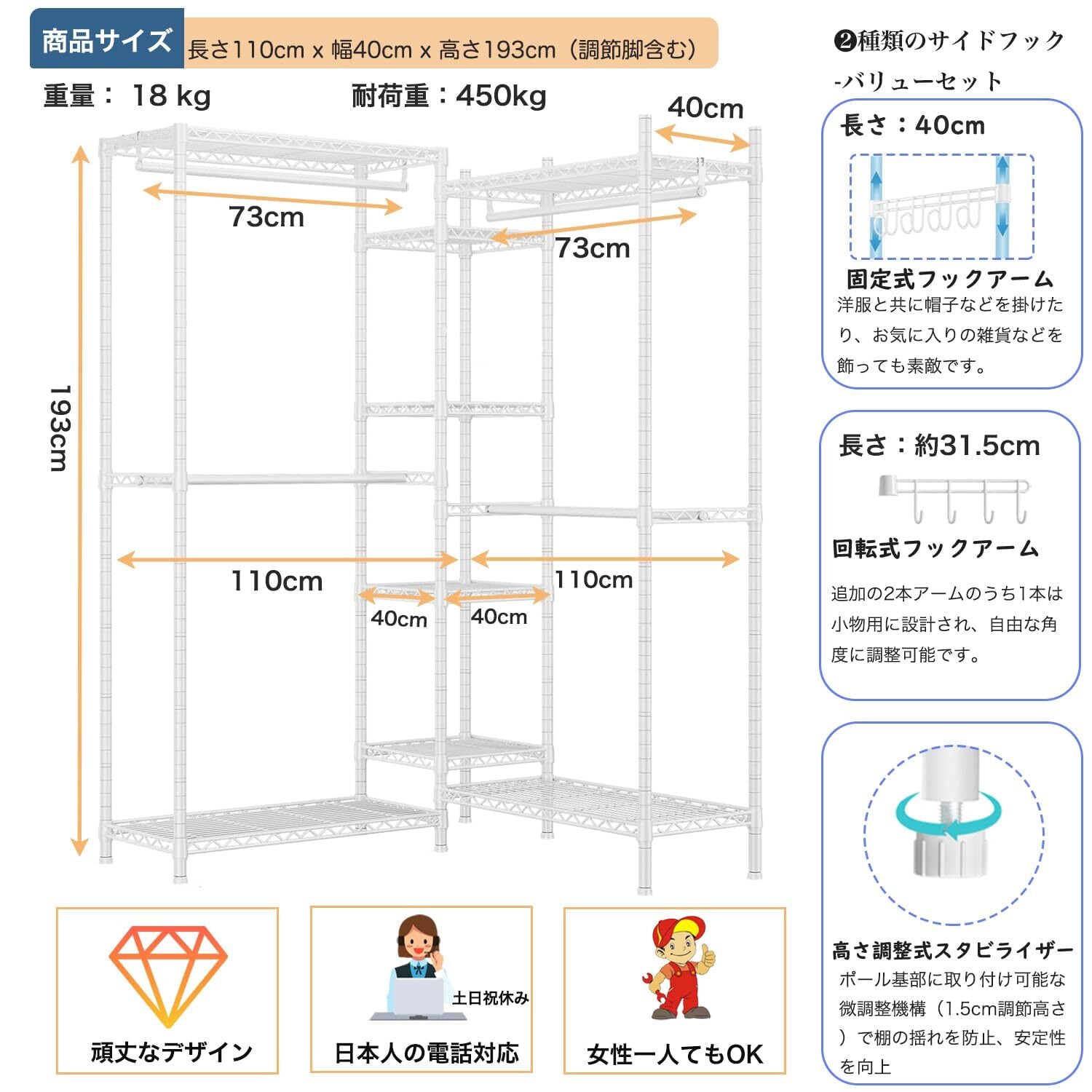 【超大容量】ユニット全体の耐荷重は約450kg。高さで十分なハンガー収納スペースを確保でき、ほとんどの衣類を収納可能。両サイドの棚部分は折りたたみ衣類や収納ボックスの配置に便利です。