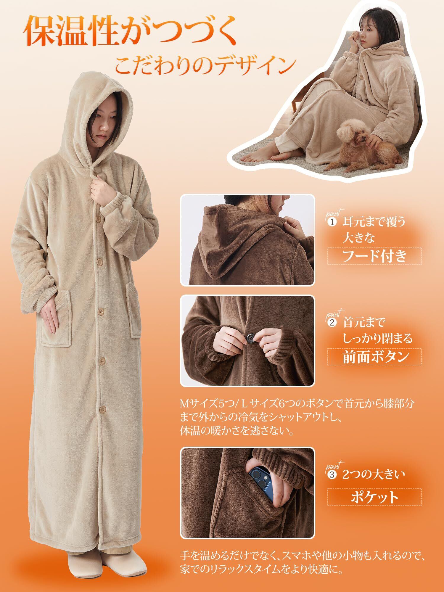 クモリ(Kumori) 冬 着る毛布 ユニセックス M-着丈110cm 暖かい 男女兼用 フランネル かい巻き ふわふわ ポケット付き ボタン付き リブ袖 フード付き 吸湿発熱 静電気防止 丸洗える ルームウェア 部屋着 あったか 春 秋 レディース メンズ 軽量 防寒 保温 着るブランケット M-着丈110cm ブラウン