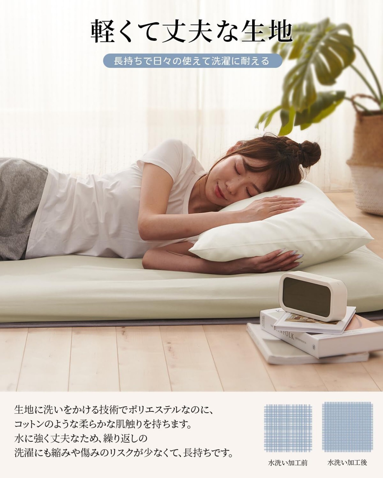 薄手でありながらも優れた吸汗性能を持ち、快適な睡眠環境を提供します。また、通気性が良く、湿気を逃がすことで、爽やかな寝心地を実現します。汗ばむ季節でも安心してご利用いただけます!