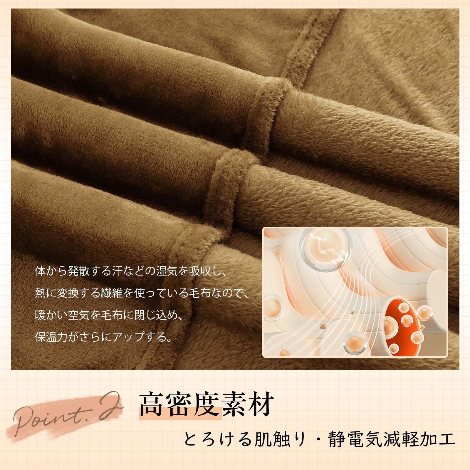 フランネルとマイクロファイバーを使用し、ふわふわとした優れた感触が特徴。この毛布があなたを包み込むことで、寒い季節でも安心してあたたかさを保てます。吸湿発熱機能も備えており、寝ている間も快適な温度をキープします。