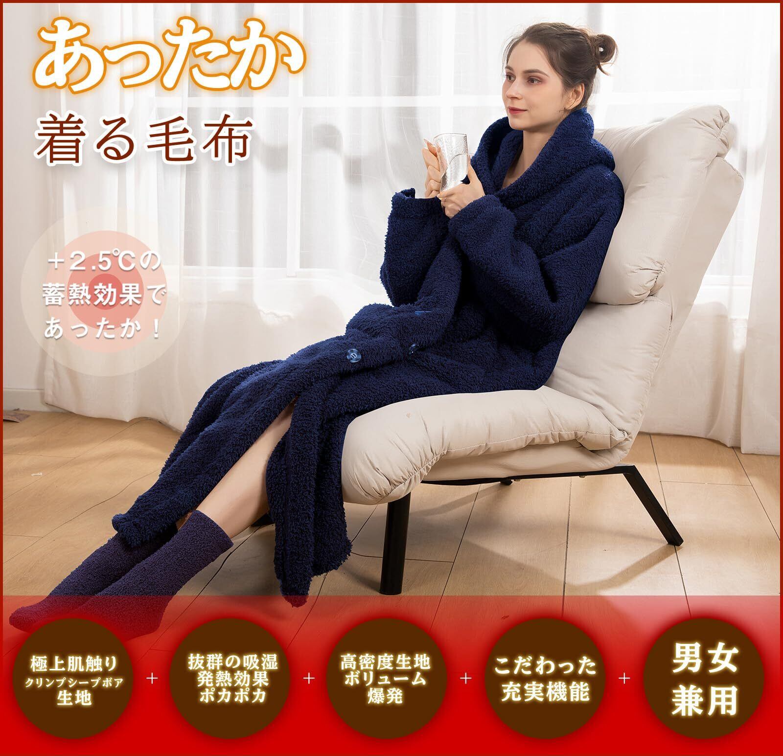 【プラス2.5℃圧倒的な保温性】当社独自のクリンプシープボア生地を使用、抜群の吸湿発熱効果と、しっとりで滑らかな肌触りを兼ね備え、まるで毛布に包まれているような安心感を提供します。保温性は普通のフランネル生地の商品よりプラス2.5℃!冬の季節にぴったりなぬくぬく着る毛布です。【着ればすぐにポカポカ】着る毛布は吸湿発熱の素材を使用しているので汗や湿気を熱に変えて保温性が高く、暖かさをしっかりキープできます。暖房をつけなくても過ごせる日が増えます。ゆったりサイズなので男女兼用で着用できます。家族みんなで使えば、暖房を付けずに過ごせる日が増えて電気代の節約にも繋がります。つい、うたた寝しちゃっても大丈夫です。【一秒で恋するもこもこ柔らかな新触感】やみつきになるふわふわ柔らかな肌触りを実感できます。肌寒さを感じるようなとき、さっと羽織って寒さをしのげて、ずっと触れていたくなるほわほわモコモコ感!