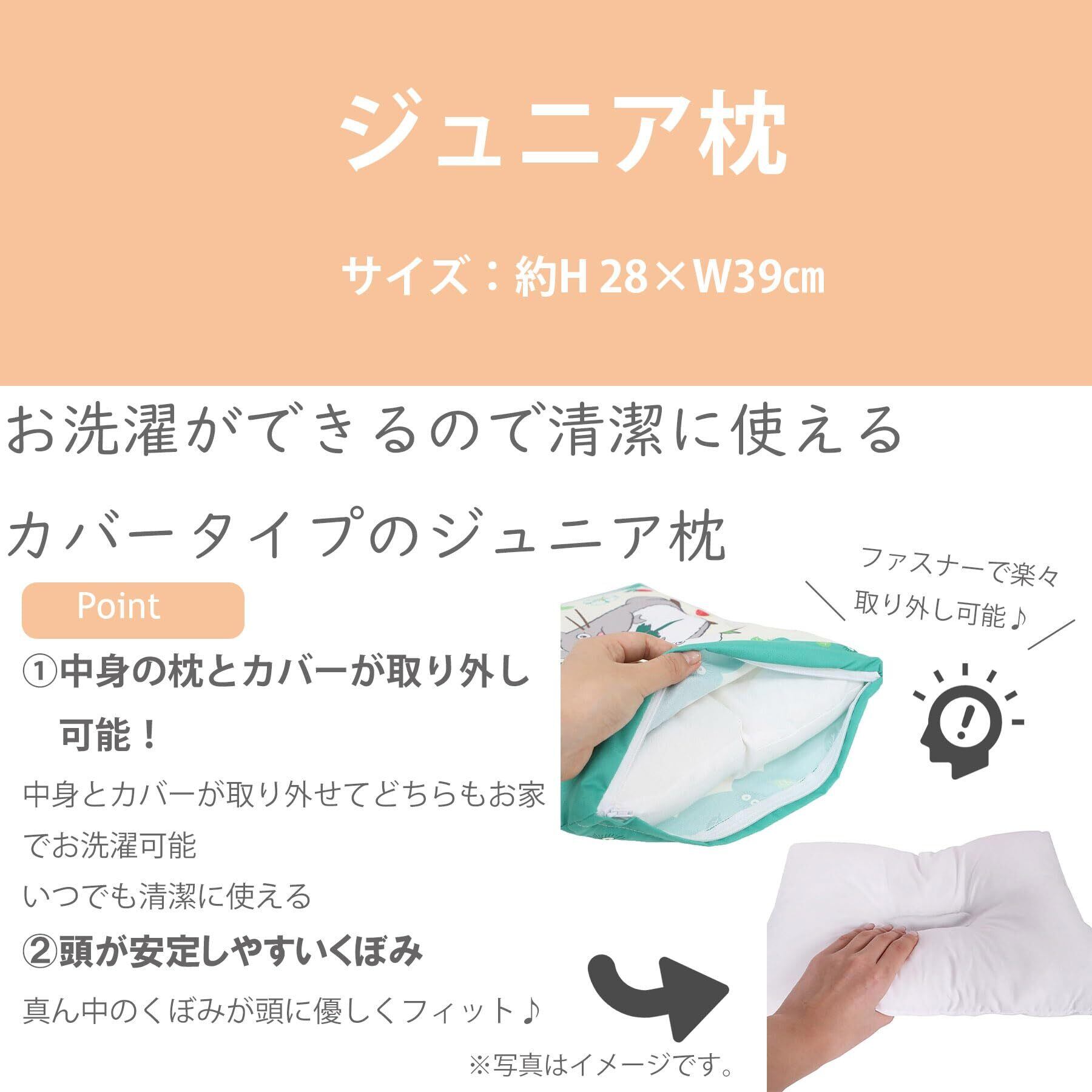 カバー取り外し可能(カバー裏面は表面と同柄)。中身の枕(白無地)手洗い可能 お子様のお昼寝にピッタリなサイズの枕です。 真ん中のくぼみが頭に優しくフィットします。