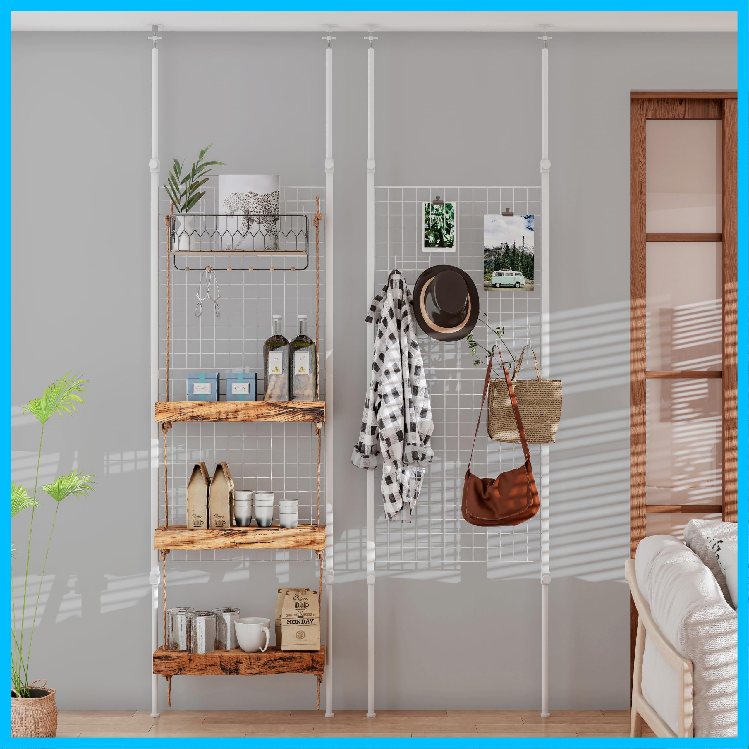 LunarLight 突っ張りメッシュパネル 突っ張り棒 突っ張りパーテーション (ワイヤーネットメッシュタイプ)幅60×奥行2.5×高さ165-290cm (3連体Sフック2個付き) 壁掛け 小物展示収納 壁面収納 天井 間仕切り 頑丈 組立簡単 耐震転倒防止 (ホワイト, 幅60㎝)