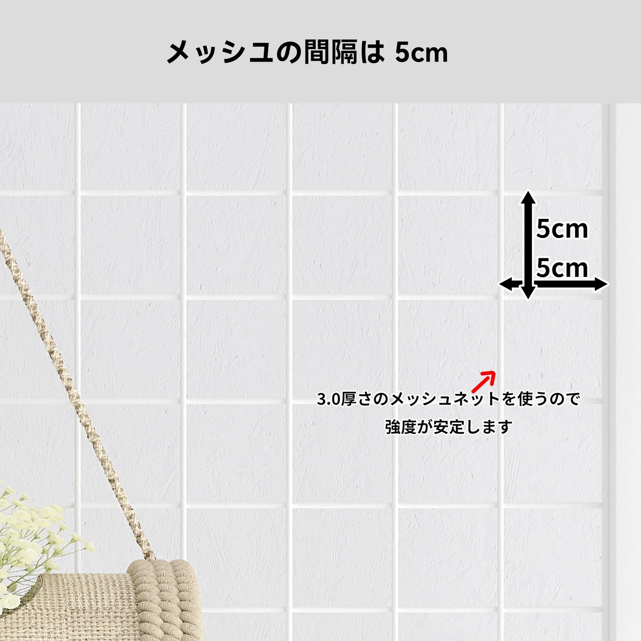 頑丈なワイヤーネットメッシュタイプのパネルは、安定感があり、耐震転倒防止機能も付いています。安心して使用できるので、家庭での利用はもちろん、オフィスや店舗でもお役立ていただけます。