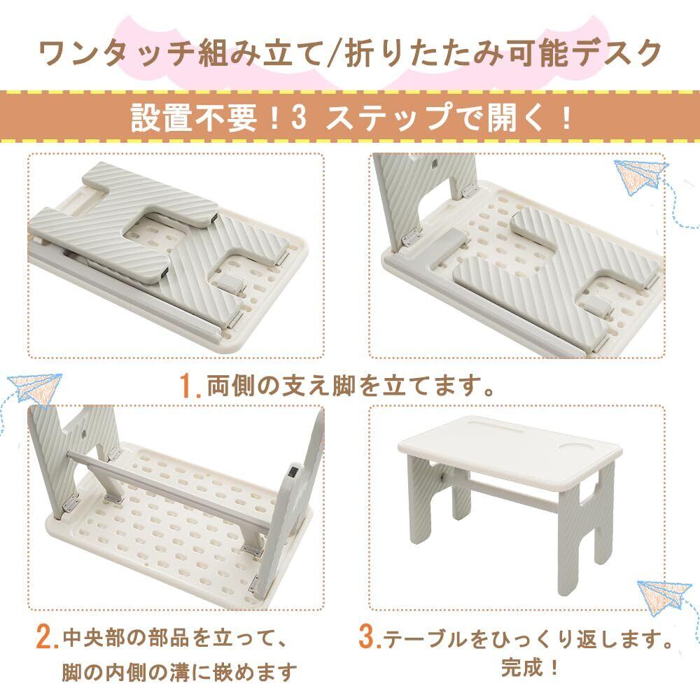 【ワンタッチ組み立て/折りたたみ可能 デスク】設置不要!3 ステップで開く!1両側の支え脚を立てます。2中央部の部品を立って、脚の内側の溝に嵌めます。3テーブルをひっくり返します。完成!そして、その手順の逆に、脚を倒せば簡単に折りたたむことができます。