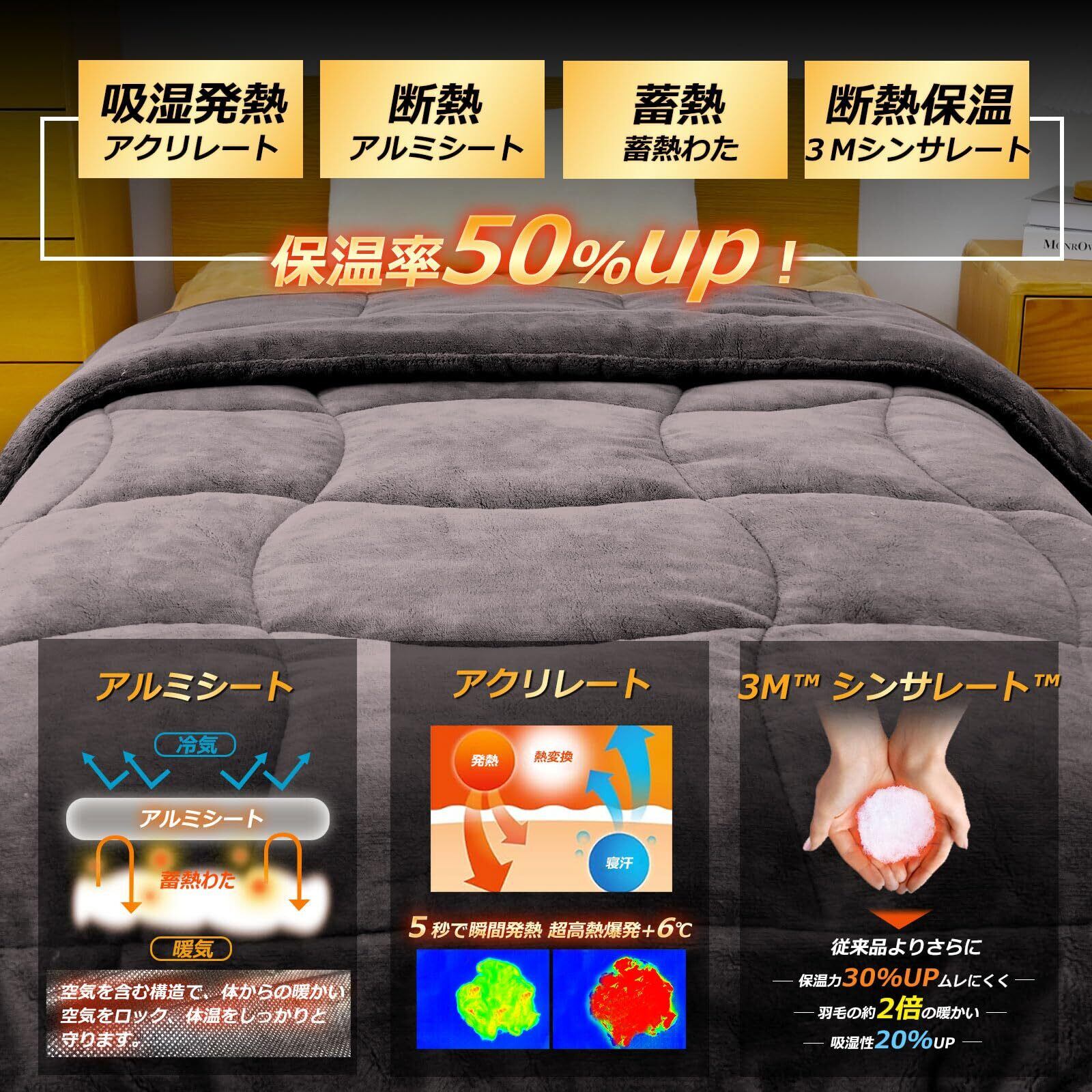 「宇宙級多重保温!暖かさ50%爆上げ革命」接触温感フランネル+最先端エアロゲル+吸湿発熱アクリレート+蓄熱綿+3Mシンサレートが織り成す最強レイヤー!冬布団は従来比保温力50%アップの極暖空間を実現。寒い夜も布団の中は別次元の温もりが持続!「寒い掛け布団に飛び込む勇気」が不要になる、人類史上最高の入眠体験を提供!