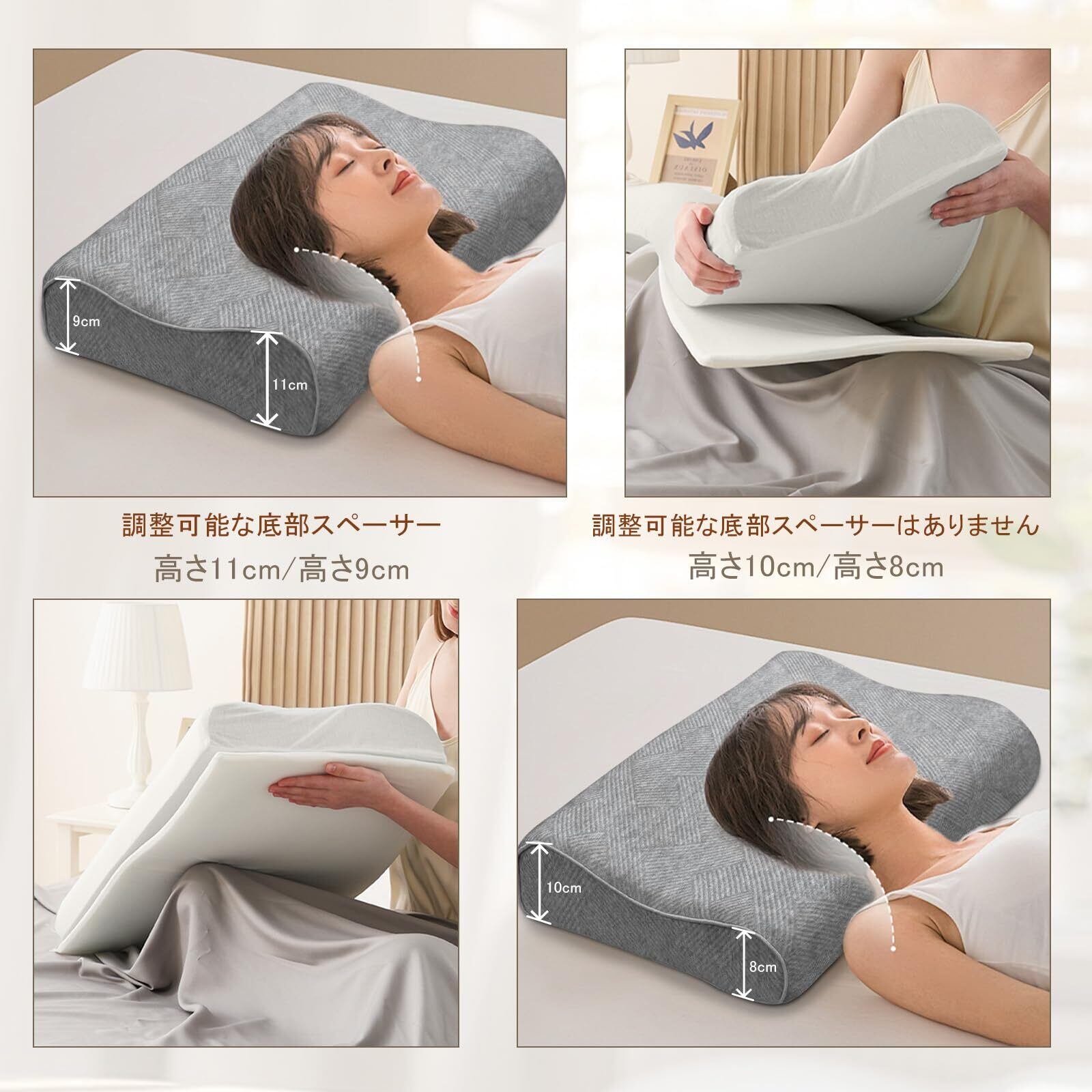 【硬さと高さを調節可能】市販の他の枕とは異なり、この低反発枕は硬さを調節できる設計になっています。スペーサーを調整することで、お好みの硬さに調整できます。さらに、枕の高さは8cmから11cmまで4段階に調節でき、最適な寝心地を見つけることができます