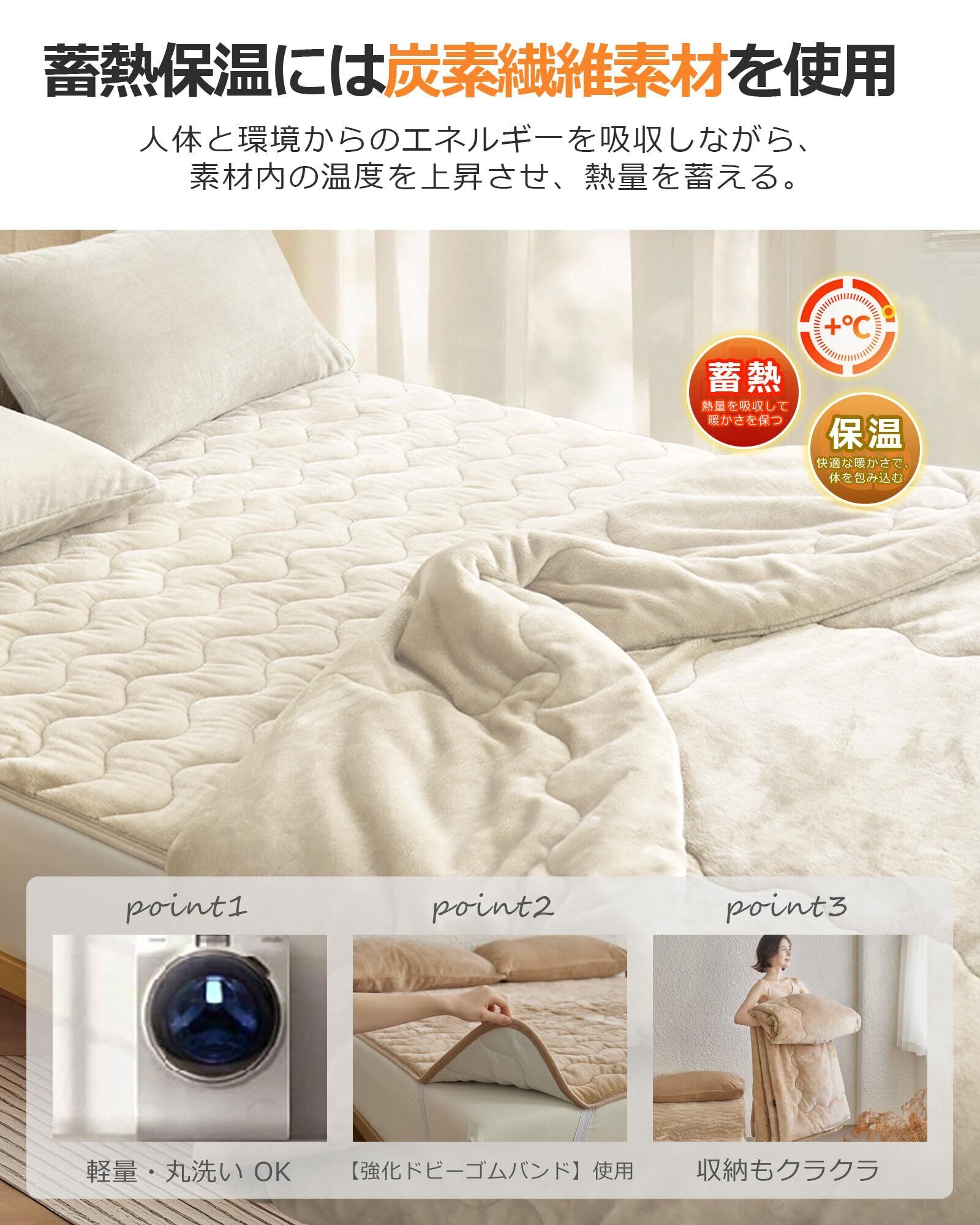 【暖かさが格段にアップ 一秒で虜になる!ふんわり、しなやか上質の肌ざわり】あったか敷きパッドの表生地はマイクロファイバー繊維を高密度に編み上げ、ふわふわ、なめらかな肌触りとあったかさを実現!モコモコのタッチで、撫でてるだけで暖かさが伝わってくれます。敷パッドの表生地に、細かい繊維の隙間にたっぷり空気を含むので、身体の熱を保持します。底冷えする冬は、朝まで背中の中から足までぽっかぽかです!あったか敷きパッドのフランネル生地は、何度も整理加工され、毛羽が簡単に抜ける問題が解決されています。長期間使用しても、触れた感触は依然として温かさを保っています。