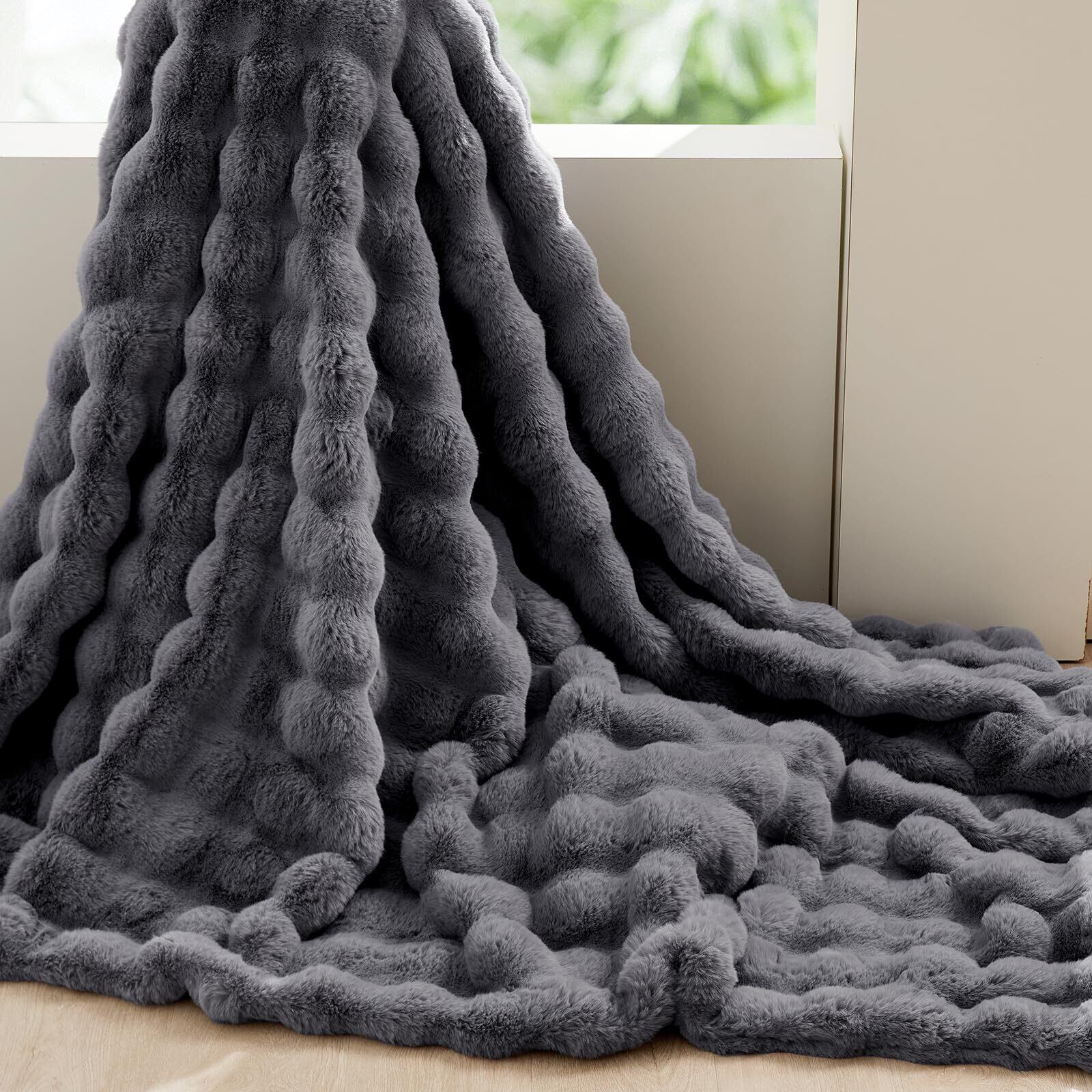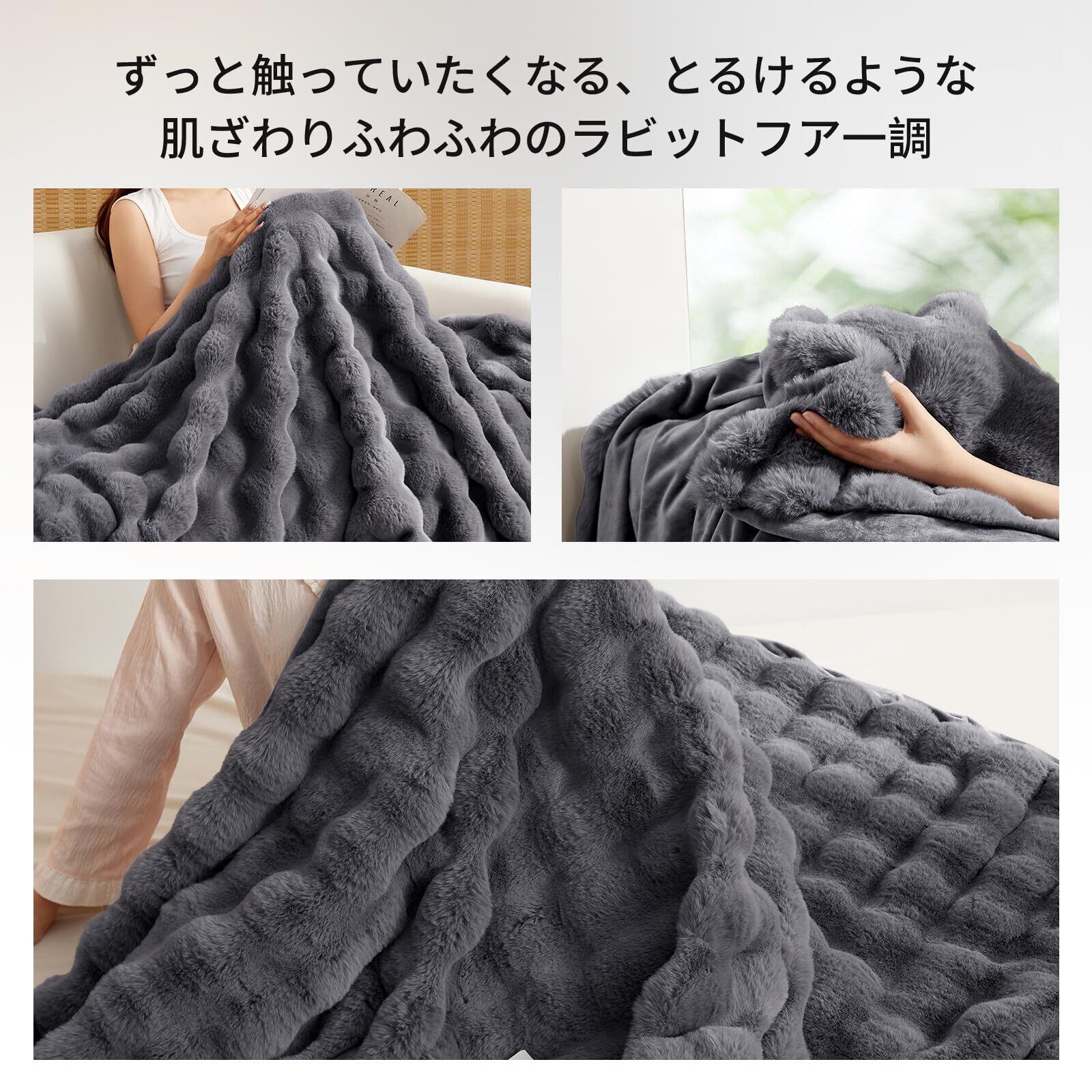 【二枚合わせ毛布、保温性アップ!】本毛布は表裏側全部上質のラビットファー調生地:表側は長めの極細繊維、内側は短めの極細繊維で仕上げており、高い保温性と、ふんわりとした極上の肌触りを両立しました。おしゃれなデザインで、日々のくつろぎタイムを温かく彩ります。