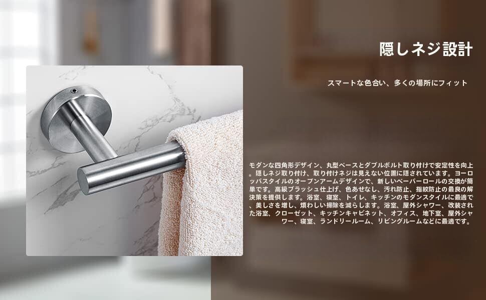 材質には304ステンレススチールを使用しており、防サビ性に優れています。水回りでの使用にも最適で、長期間にわたり美しい状態を保つことができます。しっかりとした作りで、頑丈にタオルを支えることが可能です。