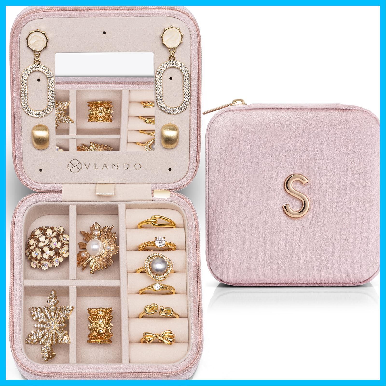 Vlando 誕生日プレゼント 女性 名前入り イニシャル ギフト アクセサリーケース 携帯用 持ち運び 鏡付き ジュエリーボックス トラベル かわいい 母の日 記念日 バレンタイン 結婚式 送別 退職 祝い 贈り物(ピンクS)