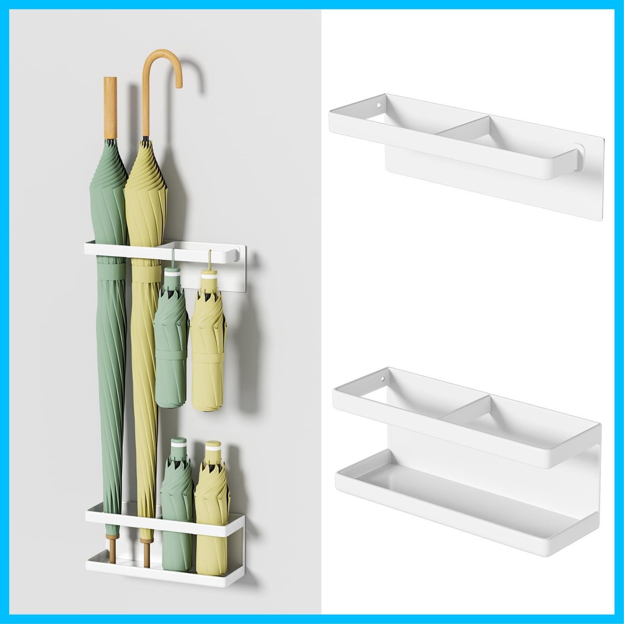 【マグネット傘立て】玄関のドアに取り付けて、傘を簡単に収納できます。ラックは防滴設計で、水が流れて床が濡れる心配もありません。鍵やタオルを簡単に整理できる吊り棚も付いています。これさえあれば、玄関ホールがすっきりきれいになります。
